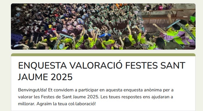 Ondara, 31.07.25. Dies després de la celebració de les festes populars d’enguany i amb l’agenda de treball focalitzada ja en el Sant Jaume 2026, des de la Regidoria de Festes i Tradicions, dirigida per Miguel Gomis, es vol conèixer l’opinió de la ciutadania en general respecte les Festes Populars Sant Jaume 2025. Per aquest motiu s’ha impulsat una enquesta anònima per a valorar les Festes de Sant Jaume 2025. Les respostes es tindran en compte i ajudaran al departament de Festes a millorar. L’enquesta es pot emplenar en la web https://santjaume.ondara.org/ en concret al següent enllaç: https://docs.google.com/forms/d/e/1FAIpQLScMSlFb9fSRsqwtY1Fwr4TVmJtzKdGChdtCWhgXyXrB4-kMIg/viewform