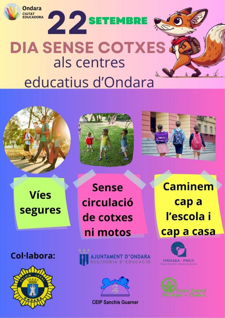 La Regidoria d’Educació, encapçalada per Rosa Ana Marí, ha presentat el projecte local sota el lema: «22 de setembre, Dia Sense Cotxes als Centres Educatius d’Ondara», amb tres eixos principals: Vies segures, Sense circulació de cotxes i motos, i Caminem cap a l’escola i cap a casa. La iniciativa comptarà amb la coordinació i supervisió de la Policia Local d’Ondara. Els centres participants són l’Escoleta Infantil Joaquina Gavilà, el Col·legi Marjals, el Col·legi Sanchis Guarner i l’IES Xebic. Durant els horaris d’entrada i eixida, els carrers d’accés a aquests centres romandran tancats al trànsit. En concret: