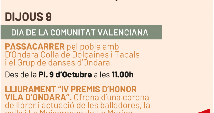 El dijous 9 d’octubre, Dia de la Comunitat Valenciana, Ondara viurà una jornada festiva amb un passacarrer pel poble a les 11 hores des de la Plaça 9 d’octubre amb d’Ondara Colla de Dolçaines i Tabals acompanyats pel Grup de Danses Ocell, i a les 12.00 hores tindrà lloc a la Plaça del Convent l’acte de Lliurament del “IV Premis d’Honor Vila d’Ondara”, que enguany es lliuraran a Pepa Granel, per la seua trajectòria i implicació en la vida cultural i social d’Ondara; Antonia Viñarta “La Curandera”, per la seua contribució a la memòria col·lectiva i a la tradició oral del poble, i Carlos Torres, per la seua dedicació i compromís amb el teixit associatiu i comunitari local. A continuació es farà l’Ofrena d’una corona de llorer al Claustre de l’Ajuntament i l’actuació de la Muixeranga de La Marina, del Grup de Danses d’Ondara acompanyades per d’Ondara Colla de Dolçaines i Tabals.