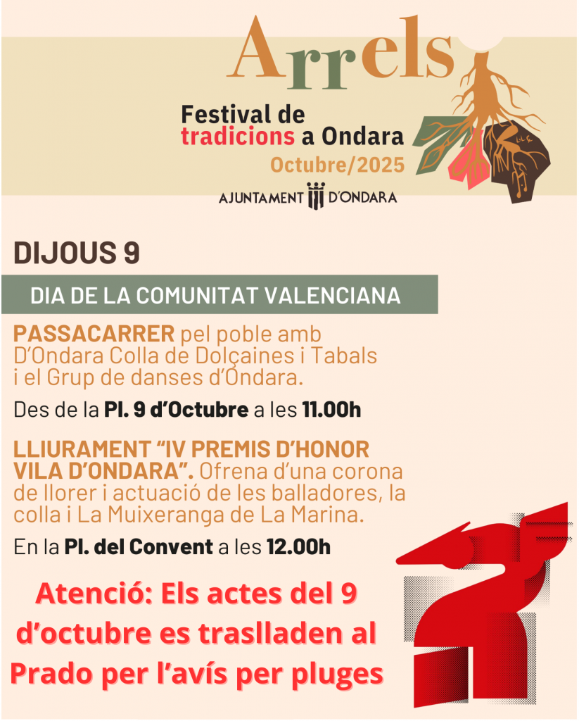 Ondara, 08.10.25. Amb motiu de l’activació de l’alerta taronja per pluges prevista per al dijous 9 d’octubre, l’Ajuntament d’Ondara informa que els actes programats per a la celebració del Dia de la Comunitat Valenciana es traslladaran al Prado, amb uns ajustos en els horaris previstos.