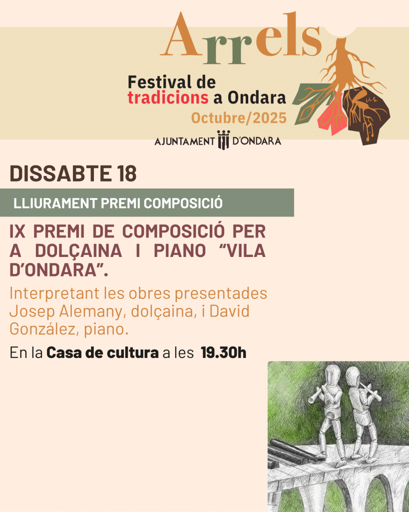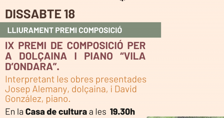 Ondara, 07.10.25. La Regidoria de Cultura de l’Ajuntament d’Ondara informa que reunit el jurat del IX Premi de Composició per a Dolçaina i Piano Vila d’Ondara, s’ha acordat que les obres «Raval» i «La Vall Blanca» siguen les finalistes del Premi d’enguany. Les obres finalistes seran interpretades per Josep Alemany Ortolà i David Gonzàlez a la Casa de Cultura d’Ondara, el dissabte dia 18 d’octubre de 2025 a les 19:30 hores. Al descans d’aquest concert, els assistents votaran per atorgar un premi especial del públic amb dotació econòmica.