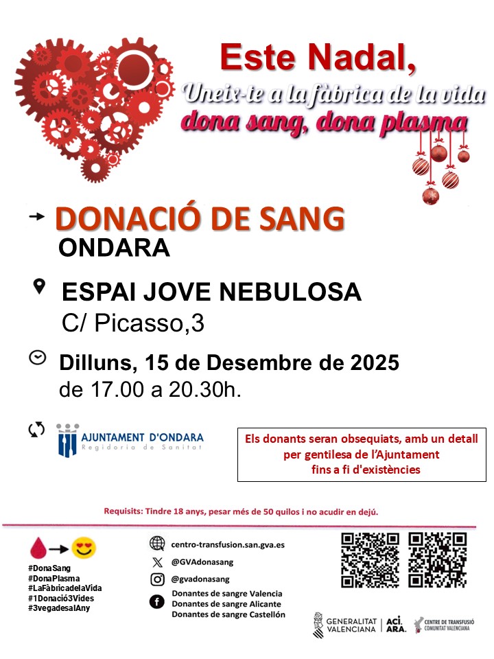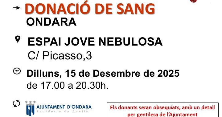 Ondara, 09.12.25. L’Ajuntament d’Ondara, a través de la Regidoria de Sanitat, anima la ciutadania a participar en la donació de sang especial per Nadal, que tindrà lloc el dilluns 15 de desembre de 2025, de 17:00 a 20:30 hores, a l’Espai Jove Nebulosa.