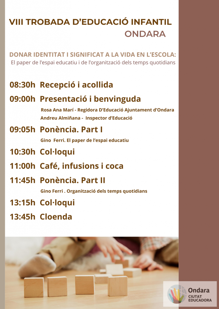 La jornada començarà a les 08:30 h amb la recepció, i a les 09:00 h tindrà lloc la benvinguda institucional a càrrec de la regidora Rosa Ana Marí i de l’inspector d’Educació, Andreu Almiñana. A continuació, iniciarà la primera ponència sobre el paper de l’espai educatiu, seguida d’un col·loqui, una pausa per al café i, a partir de les 11:45 h, la segona part dedicada a l’organització dels temps quotidians. L’activitat es prolongarà fins a les 14:00 h, amb cloenda al voltant de les 13:45 h.