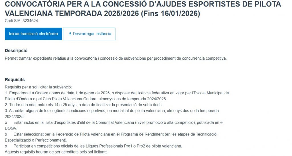Ondara, 07.01.26. L’Ajuntament d’Ondara recorda que fins al 16 de gener de 2026 està obert el termini per a presentar sol·licituds a la Convocatòria per a la concessió d’ajudes a esportistes de pilota valenciana per a la temporada 2025/2026, publicada al BOP d’Alacant el 23 de desembre de 2025.