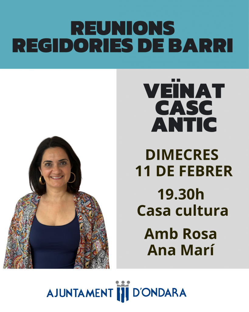 Ondara, 10.02.26. L’Ajuntament d’Ondara celebrarà aquest dimecres 11 de febrer, a les 19:30 hores, una nova sessió de les Reunions de Barri, corresponent al Casc Antic. La trobada tindrà lloc a la Casa de Cultura i estarà dirigida per Rosa Ana Marí, regidora responsable de la zona.