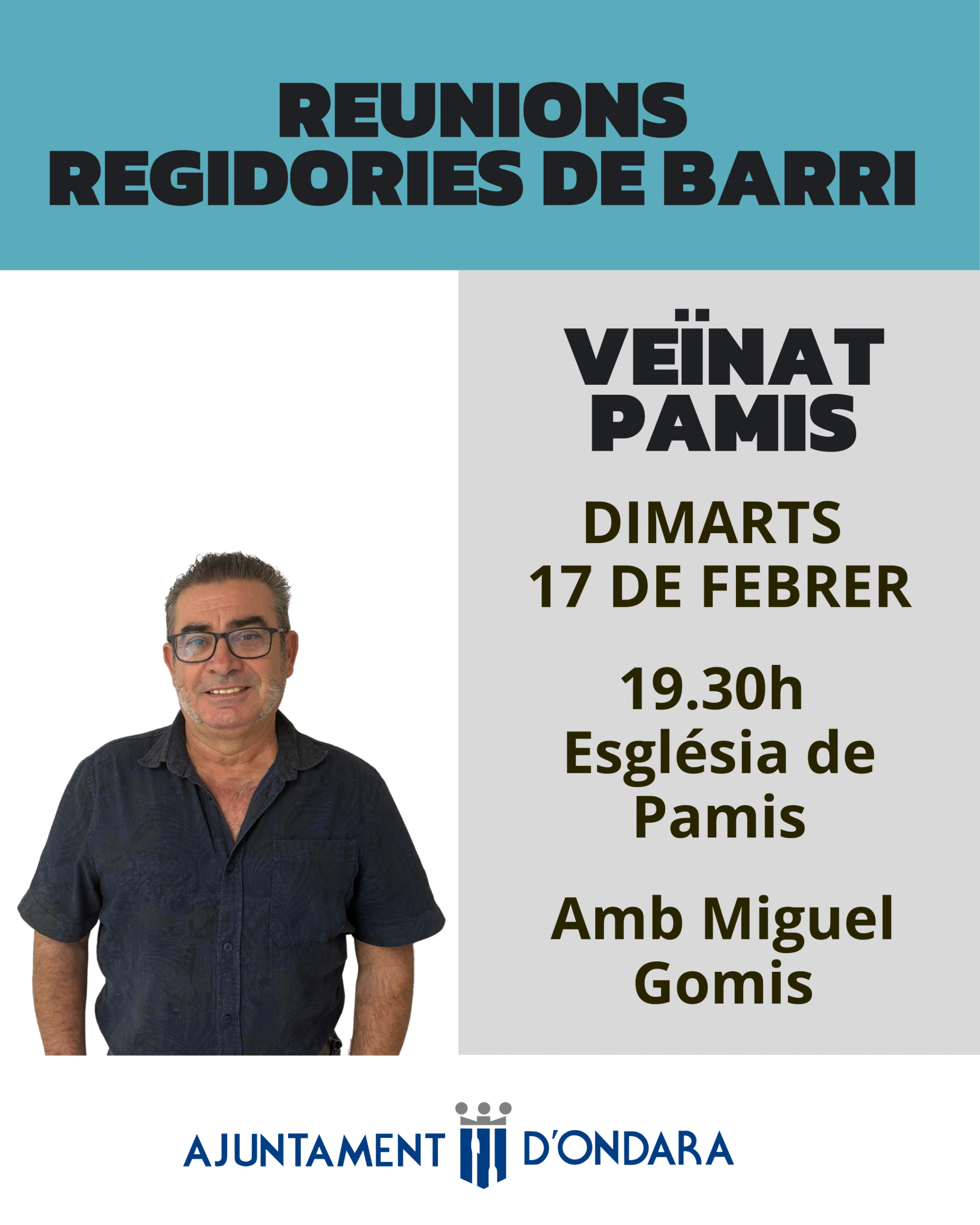 Ondara, 16.03.26. Demà dimarts 17 de març, l’Ajuntament d’Ondara ha convocat una nova Reunió de Barri de Pamis, en el marc del programa de Regidories de Barri, amb la finalitat de donar continuïtat al treball iniciat en la trobada anterior i mantindre un canal directe amb els residents de Pamis i de les partides rurals. La reunió de demà tindrà lloc a les 19:30 h, a l’Església de Pamis, i estarà encapçalada de nou pel regidor Miguel Gomis, qui informarà el veïnat sobre els avanços realitzats,, recollirà noves inquietuds i continuarà establint un diàleg pròxim amb la ciutadania.