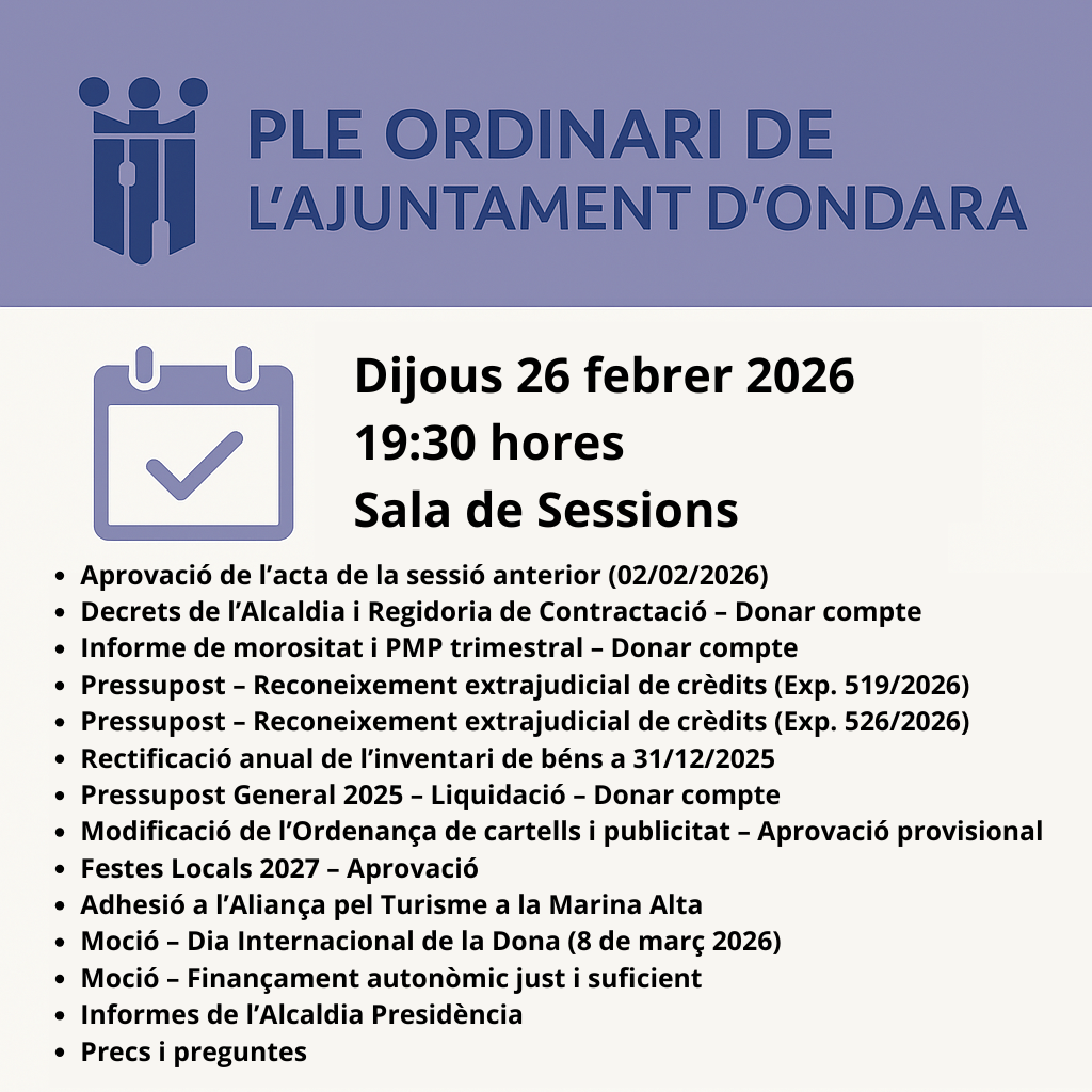 Ondara, 24.02.26. L’Ajuntament celebra ple ordinari de la Corporació Municipal el dijous 26 de febrer a les 19:30 hores. L’ordre del dia és el següent: