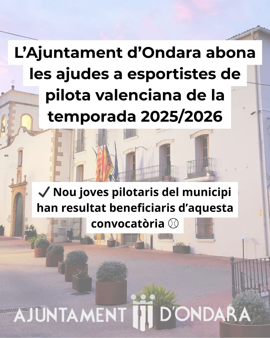 Ondara, 04.03.26. L’Ajuntament d’Ondara ha abonat hui 4 de març les ajudes municipals dirigides al perfeccionament i professionalització d’esportistes de pilota valenciana per a la temporada 2025/2026. En total, nou joves pilotaris del municipi han resultat beneficiaris d’aquesta convocatòria, impulsada per la Regidoria d’Esports.