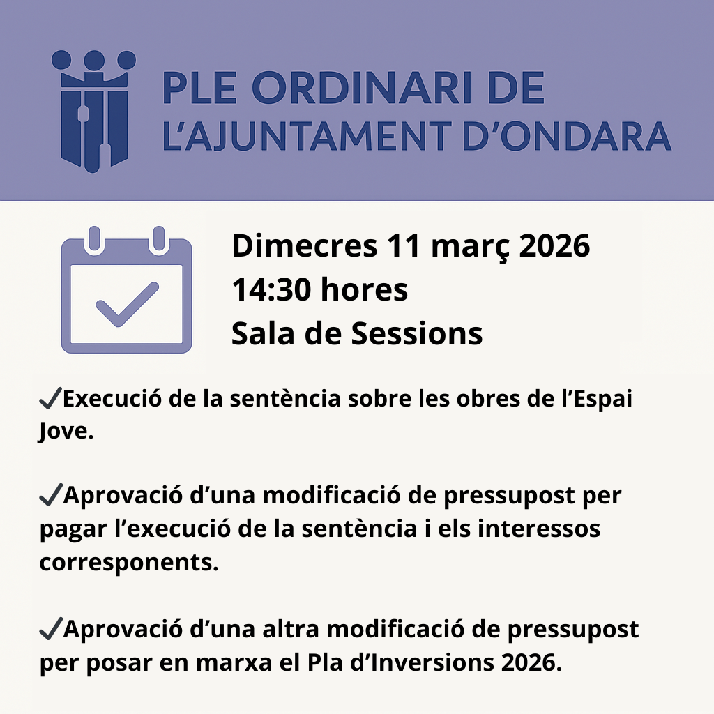 Ondara, 05.03.26. L’Ajuntament d’Ondara informa que s’ha convocat un ple extraordinari per al dimecres 11 de març de 2026, a les 14:30 hores, que tindrà lloc a la Sala de Sessions del consistori.