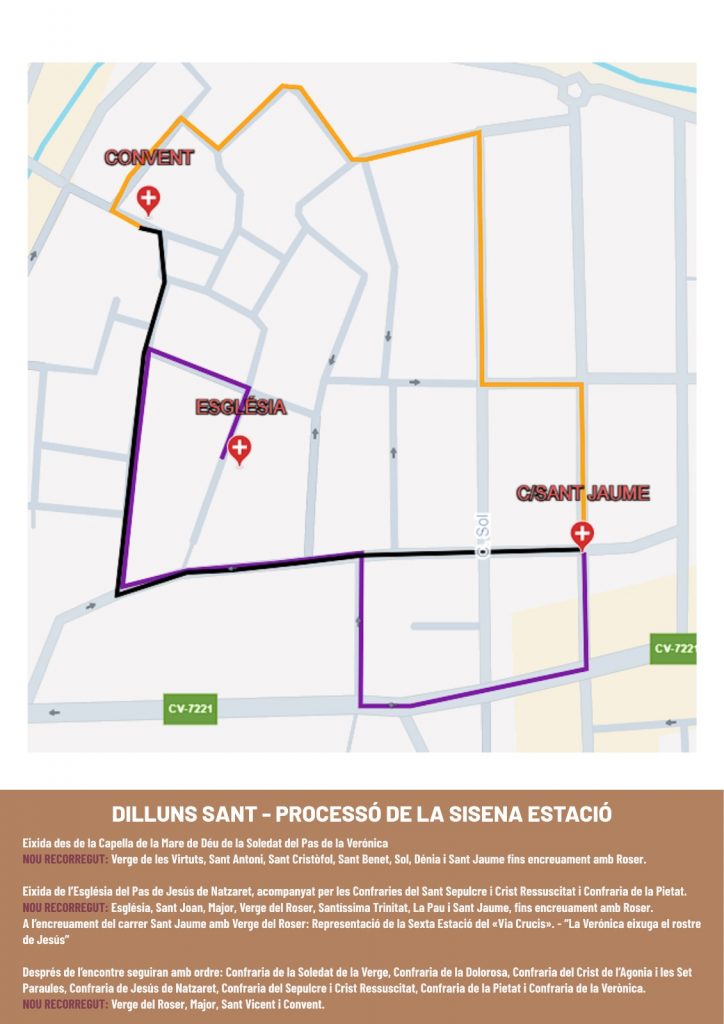 Recorregut: Convent, Sant Vicent, Major, Verge del Roser, Sol, Sant Benet, Sant Cristòfol, Verge de les Virtuts, Convent.