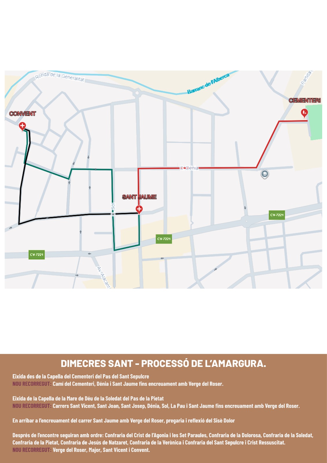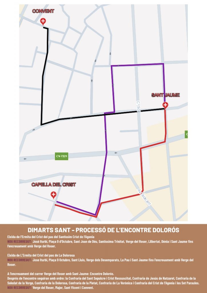 Per cert, des de la Junta Central de Confraries han informat que amb motiu del canvi d’ubicació dels Encontres de Dilluns, Dimarts i Dimecres Sant d’aquesta Setmana Santa, s’ha procedit a modificar els recorreguts habituals de les processons corresponents a aquests dies. Per aquest motiu, es prega a totes les persones participants, confraries, portadors, així com al públic assistent, que presten una especial atenció als nous itineraris establerts i que seguisquen en tot moment les indicacions de l’organització.