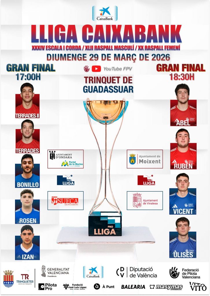La gran final serà aquest diumenge 29 de març en el trinquet de Guadassuar (17:00h) contra Bonillo, Rosen i Izán (Ajuntament de Sueca). Aquest matí s’han presentat a l’Alqueria Julià (València), amb la presència del Regidor d’Esports de l’Ajuntament d’Ondara, Jordi Ruiz, les dos últimes finals de la Lliga CaixaBank.