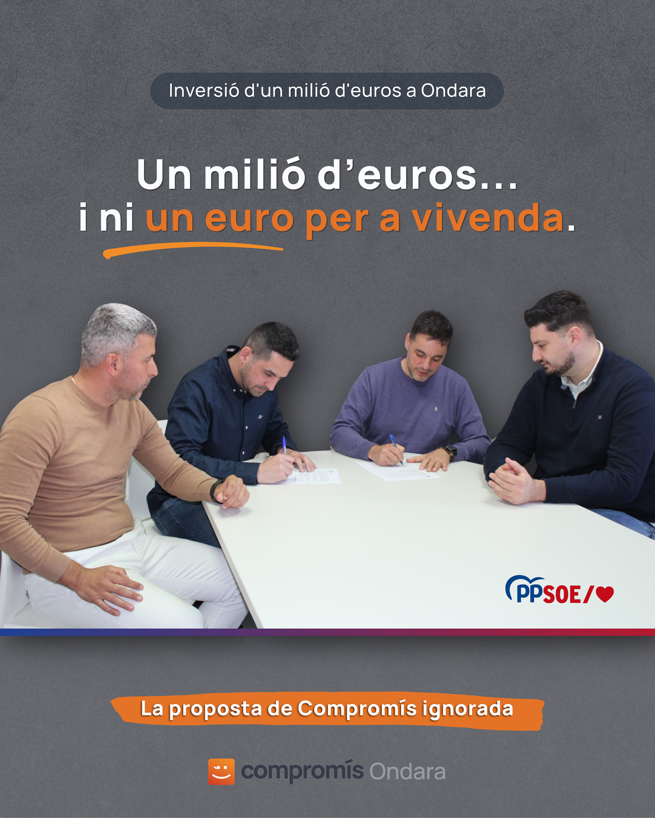 Una vegada més queda evidenciat el bipartidisme que deixa al partit socialista retratat pactant amb un PP que només fa uns mesos tractava de ningunejar-los públicament. Mentrestant, alguns intenten responsabilitzar Compromís, nosaltres precisament hem tractat de defensar que el milió es decidira amb participació pensant en les necessitats bàsiques de la gent i no hi ha res més urgent que l’habitatge a Ondara. Altres pobles veïns ja han mogut fitxa al respecte, per tant, és una realitat que ambdós partits (PP-PSOE) no volen compartir preferint la política de la foto i la inauguració.