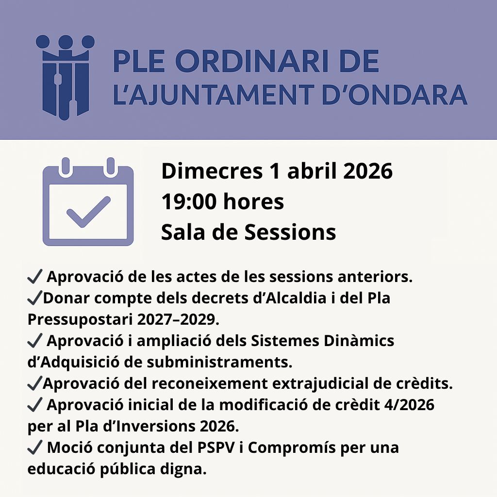 Ondara, 30.03.26. L’Ajuntament d’Ondara celebrarà el pròxim dimecres 1 d’abril de 2026, a les 19 hores, el ple ordinari mensual. La sessió inclourà diversos punts rellevants en matèria econòmica, de contractació pública i una moció en defensa de l’educació pública.