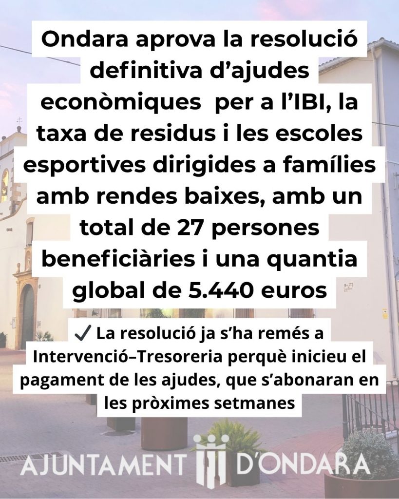 La resolució definitiva es pot consultar íntegrament al tauler d’anuncis de la seu electrònica municipal (https://ondara.sedelectronica.es ). Així mateix, s’ha remés l’acord al Departament d’Intervenció–Tresoreria perquè procedisca al pagament de les ajudes concedides.