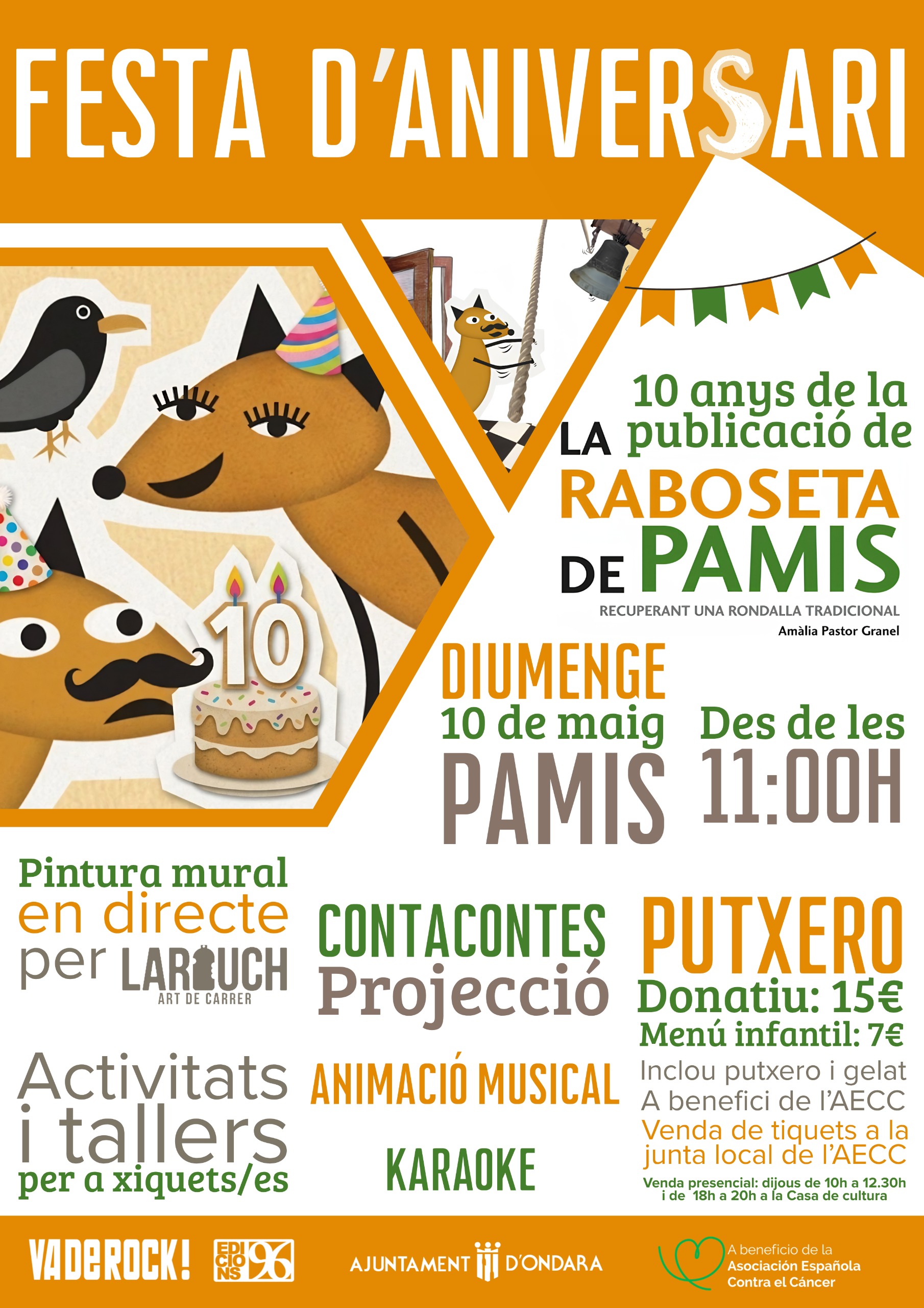 Un dels actes centrals de la jornada serà la realització en directe, per «Larouch art de carrer», d’un mural representatiu de La Raboseta de Pamis, que s’ubicarà al muret exterior de l’escoleta de Pamis. El mural servirà com a element permanent de record i de posada en valor d’aquest conte popular, convertit ja en un símbol del patrimoni immaterial local. Al llarg de tot el matí hi haurà jocs, tallers i activitats infantils inspirades en la rondalla, com ara un pinta-cares de raboseta, jocs com pescar ingredients de putxero, així com animació musical amb DJ durant tot el matí, per tal de crear un ambient festiu i familiar. La jornada inclourà també un putxero popular per a dinar, amb un clar vessant solidari, ja que es realitzarà a benefici de l’Associació Espanyola Contra el Càncer (AECC). Els tiquets per al putxero es podran adquirir a través de la Junta Local de l’AECC. Després de dinar, la festa continuarà amb karaoke, obert a la participació de totes les persones assistents.