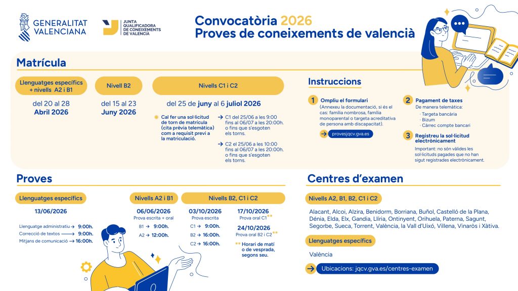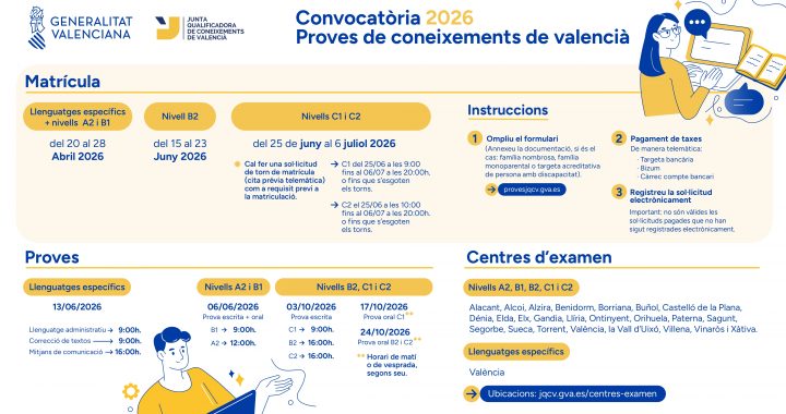 Ondara, 22.04.26. L’oficina ADL d’Ondara informa sobre la convocatòria 2026 de les proves de coneixements de valencià de la Junta Qualificadora de Coneixements de Valencià (JQCV), que inclou els diferents nivells i calendaris arreplegats al díptic informatiu: