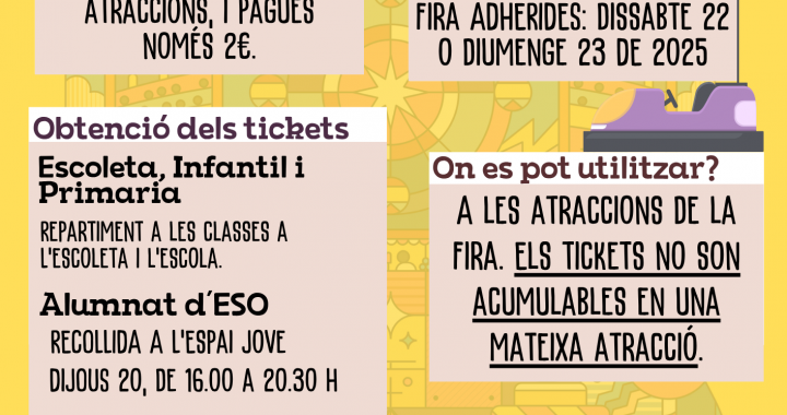 Des del Departament de Joventut es distribuiran tiquets de descomptes als xiquets/es i joves (nascuts fins el 2009) per obtindre preus reduïts en aquest darrer cap de setmana de les atraccions