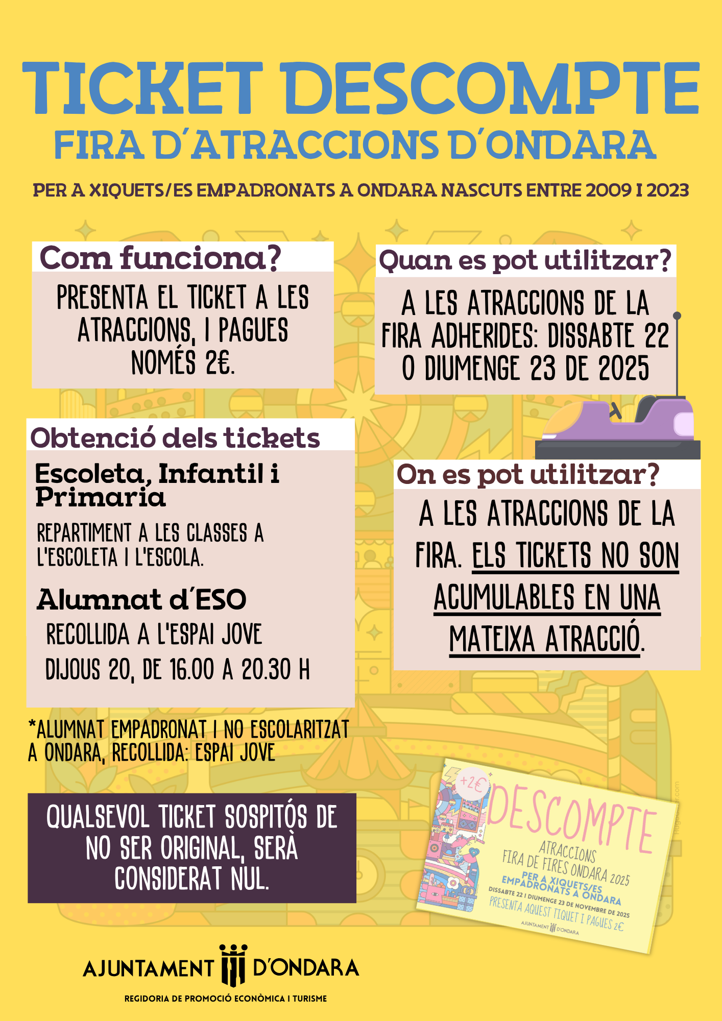 La Fira d’Atraccions, que ha estat present des del primer dia, continuarà oberta fins diumenge 23 al seu emplaçament habitual del carrer Nacions Sense Estat, amb jornades especials per a xiquets i xiquetes i preus reduïts el dimecres 19 de novembre; i amb descomptes en les atraccions durant aquest últim cap de setmana. I és que, amb l’objectiu de facilitar l’accés de la infància i adolescència a la fira d’atraccions, cada xiquet/a empadronat a Ondara, nascut fins el 2009 rebrà, per part de l’Ajuntament d’Ondara, tres tiquets descompte per a les atraccions de la fira d’aquest cap de setmana (22-23 de novembre). Presentant el tiquet facilitat per l’Ajuntament d’Ondara només caldrà abonar l’import de 2 euros a les atraccions, obtenint així un descompte que facilitarà l’accés de tots els xiquets i xiquetes a les atraccions de la fira. Els tiquets no són acumulables en una mateixa atracció; s’han d’utilitzar en diferents atraccions, i qualsevol tiquet sospitós de no ser original, serà considerat nul i no es podrà utilitzar. Els tiquets es poden utilitzar dissabte 22 i diumenge 23 a les atraccions de la fira. Els tiquets per a l’alumnat d’infantil i primària es repartiran als respectius centres educatius (Escoleta, Marjals i Sanchis Guarner). Els que cursen des de 1er d’ESO i fins als nascuts al 2009, hauran de recollir els tiquets el dijous 20 de novembre a l’Espai Jove des de les 16 fins les 20:30 hores. Aquells xiquets/es empadronats a Ondara, però que no cursen els cicles d’infantil i primària als centres educatius d’Ondara, hauran de recollir els seus tiquets a l’Espai Jove en el mateix horari.+