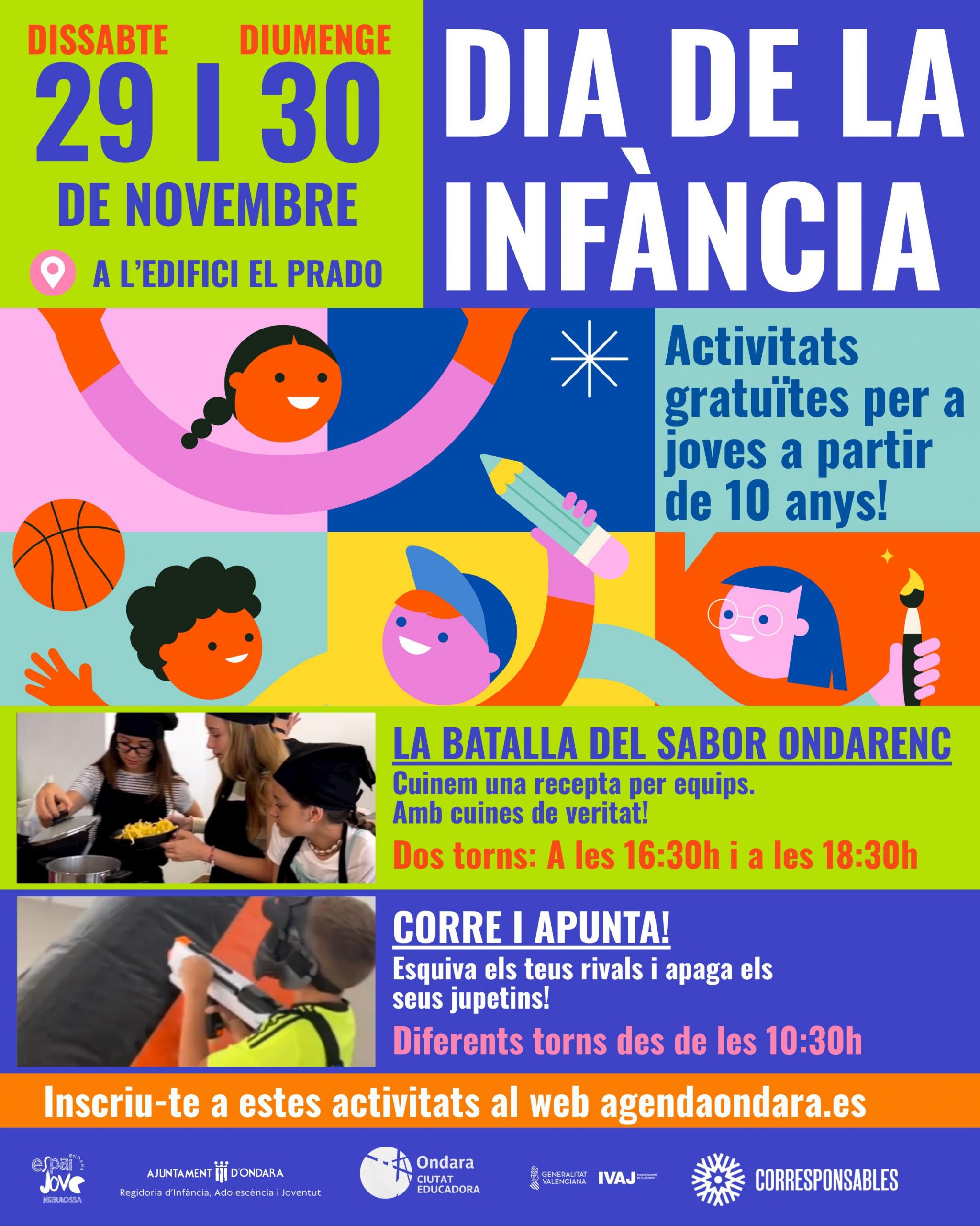 Ondara, 21.11.25. L’Ajuntament d’Ondara, a través de la Regidoria de Joventut, celebrarà el Dia de la Infància el cap de setmana del 29 i 30 de novembre amb activitats gratuïtes per a joves a partir de 10 anys, que tindran lloc a l’edifici El Prado. La particularitat d’aquesta edició és que les propostes han estat dissenyades pels xiquets i xiquetes del Consell Local d’Infància i Adolescència (CLIA), donant protagonisme a la participació infantil en la programació.