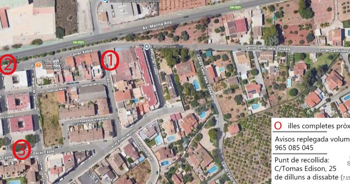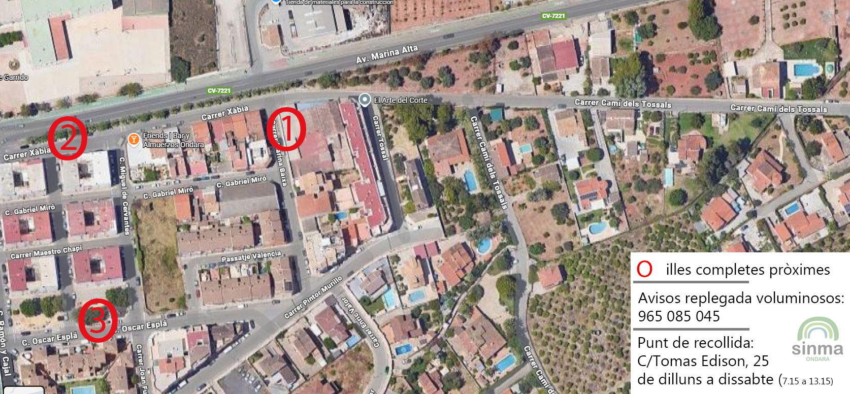 Per garantir el servei, SINMA ha publicat un mapa amb les illes completes més pròximes, situades a uns 300 metres, i recorda que continua operatiu l’Ecoparc municipal (C/ Tomás Edison, 25), amb horari de dilluns a divendres, de 7:15 a 13:15 hores. Telèfon per a recollida de mobles: 965 085 045.
