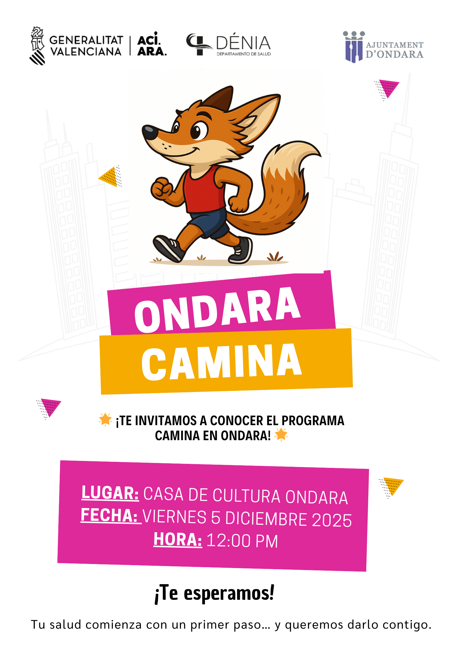Aquest projecte compta amb el suport de la Conselleria de Sanitat i el Departament de Salut de Dénia, i pretén incorporar el moviment a la rutina diària mitjançant caminades guiades i consells pràctics. La teua salut comença amb un primer pas… i volem donar-lo amb tu! Vine a conéixer el programa i suma’t a una iniciativa que cuida de tu i del teu benestar.