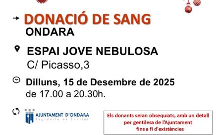 Ondara, 09.12.25. L’Ajuntament d’Ondara, a través de la Regidoria de Sanitat, anima la ciutadania a participar en la donació de sang especial per Nadal, que tindrà lloc el dilluns 15 de desembre de 2025, de 17:00 a 20:30 hores, a l’Espai Jove Nebulosa. Sota el lema “Este Nadal, uneix-te a la fàbrica de la vida: […]
