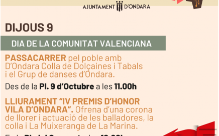 Ondara, 08.10.25. Amb motiu de l’activació de l’alerta taronja per pluges prevista per al dijous 9 d’octubre, l’Ajuntament d’Ondara informa que els actes programats per a la celebració del Dia de la Comunitat Valenciana es traslladaran al Prado, amb uns ajustos en els horaris previstos. Així, a les 11:30 hores començarà l’acte amb l’actuació de […]