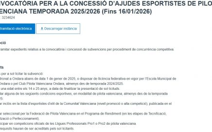 Ondara, 07.01.26. L’Ajuntament d’Ondara recorda que fins al 16 de gener de 2026 està obert el termini per a presentar sol·licituds a la Convocatòria per a la concessió d’ajudes a esportistes de pilota valenciana per a la temporada 2025/2026, publicada al BOP d’Alacant el 23 de desembre de 2025. Aquestes ajudes, amb una dotació global […]